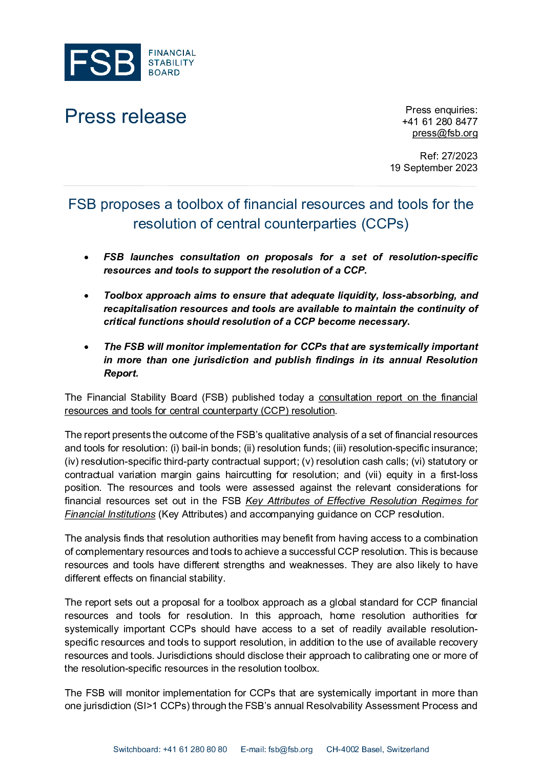 The FSB invites comments on the report and accompanying questions. Written responses should be sent to [email protected] by 20 November 2023 with the title “CCP resolution resources and tools”. Responses will be published on the FSB’s website unless respondents expressly request otherwise.