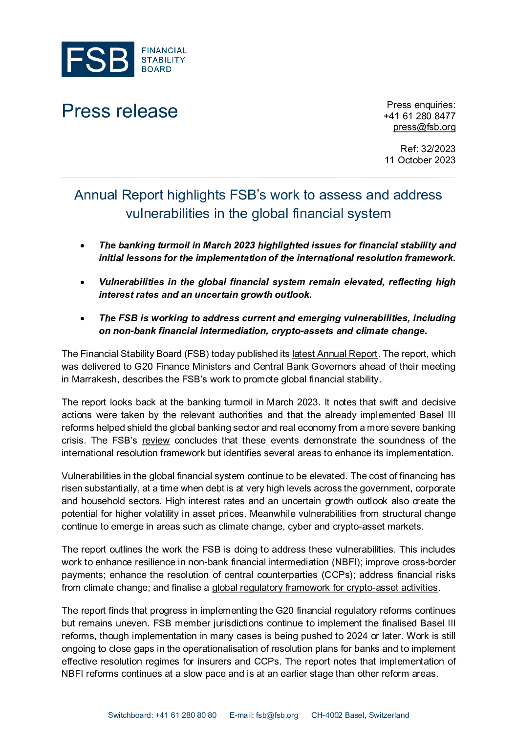 The banking turmoil in March 2023 highlighted issues for financial stability and provides initial lessons for the design and implementation of the G20 reforms. Vulnerabilities in the global financial system continue to be elevated, reflecting high interest rates and an uncertain growth outlook, while vulnerabilities from structural change continue to emerge in areas such as climate change, cyber and crypto-asset markets.