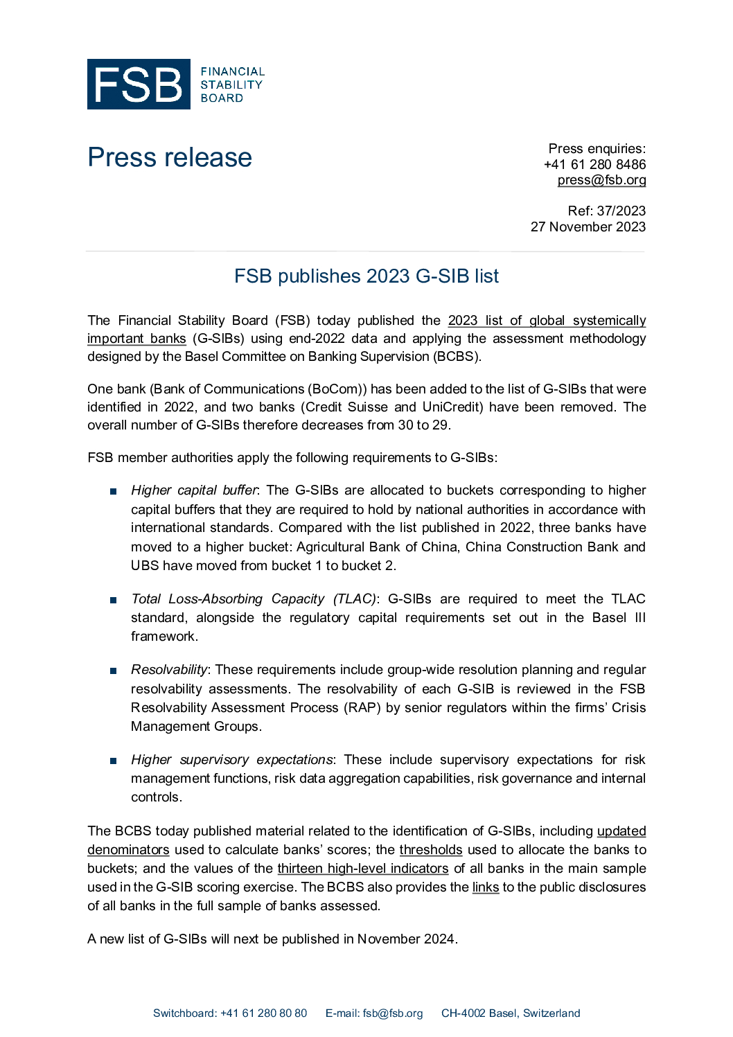 - The Financial Stability Board (FSB), in consultation with Basel Committee on Banking Supervision (BCBS) and national authorities, has identified the 2023 list of global systemically important banks (G-SIBs).1 The list is based on end-2022 data,2 based on a methodology agreed upon in July 2018 and implemented for the first time in the end-2021 G-SIB assessment.3