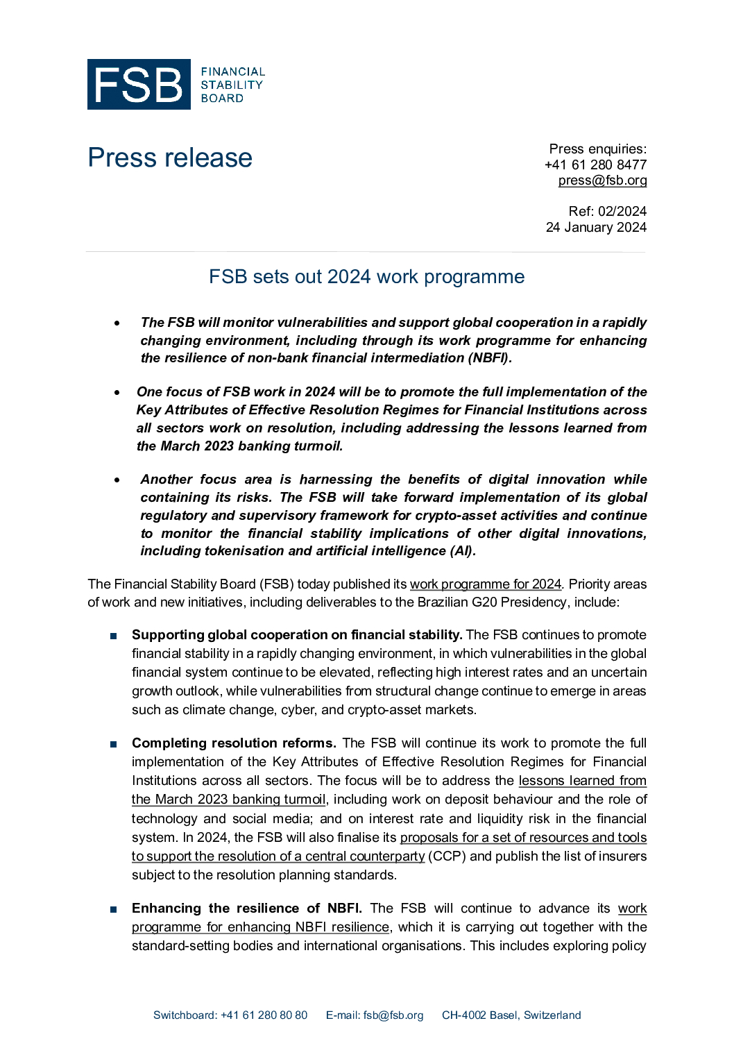 This work programme details the FSB’s planned work, sets out new initiatives and provides an indicative timeline of main publications for 2024.