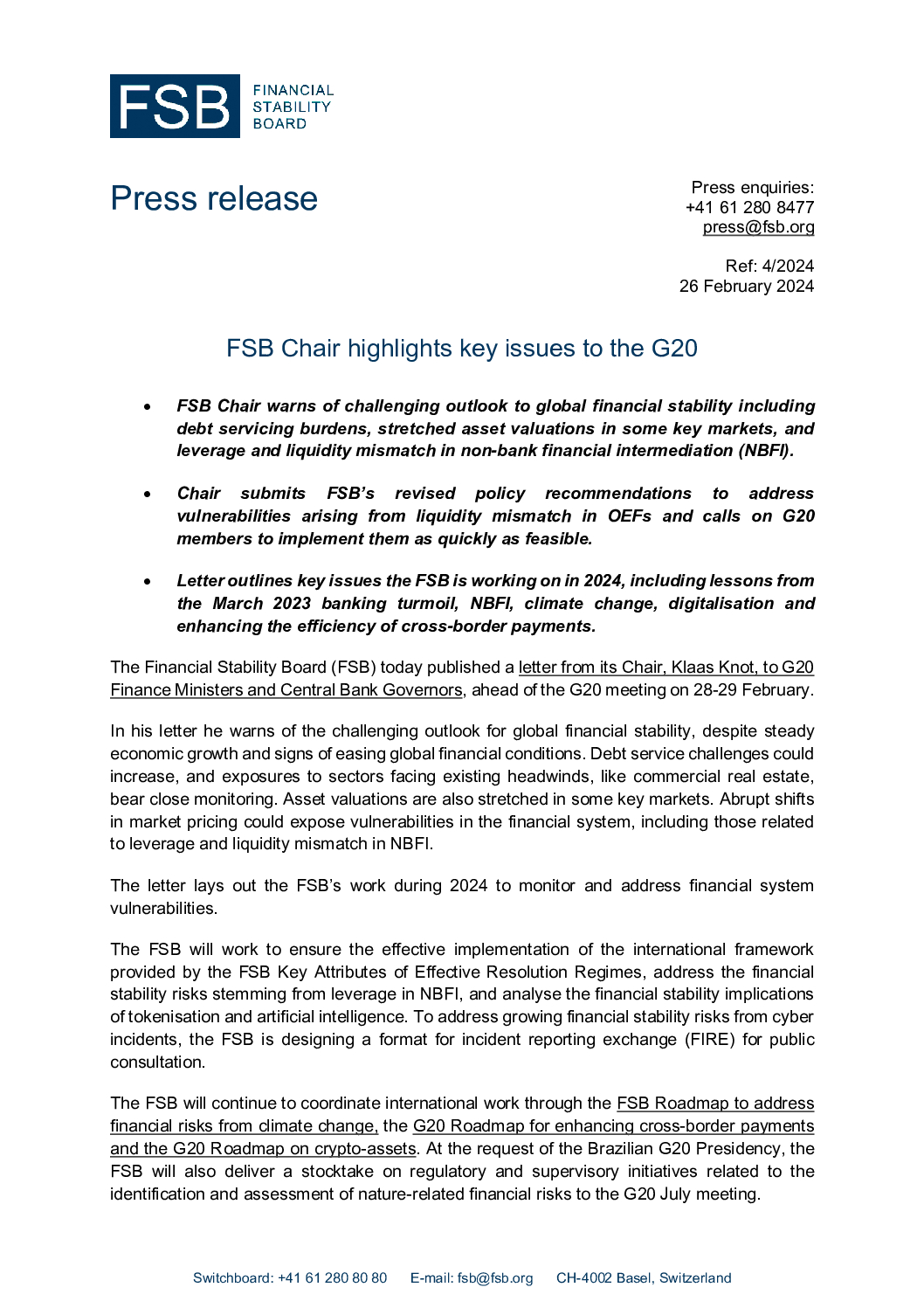 The letter lays out the FSB’s workplan for 2024. Core elements of this plan are to identify and address financial system vulnerabilities in key areas including lessons from the March 2023 banking turmoil, NBFI, digitalisation and climate change; and to enhance the efficiency of cross-border payments.