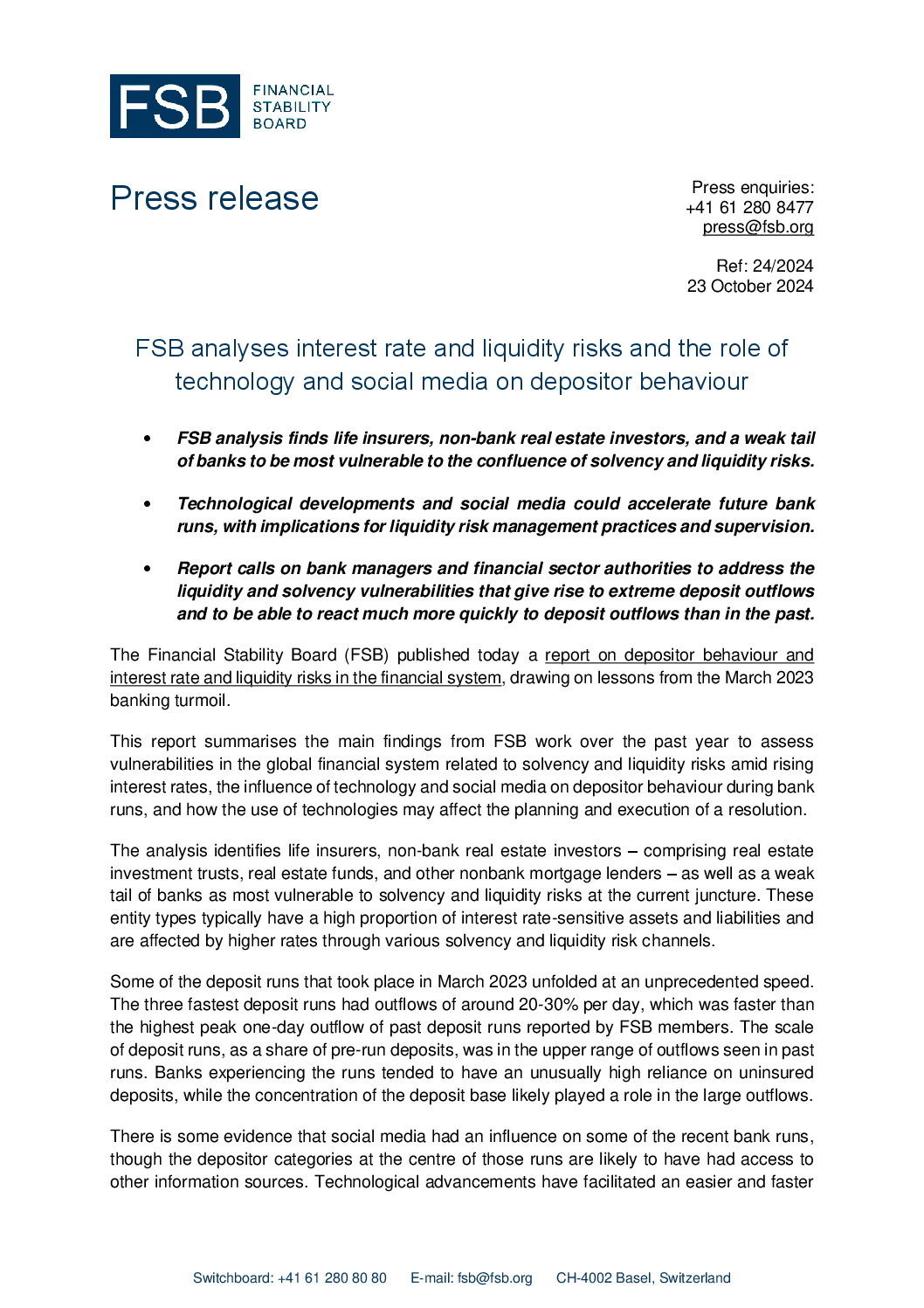 The report finds that the three entity types most vulnerable to a combination of solvency and liquidity risks at the current juncture are: (i) a weak tail of banks, (ii) life insurers, and (iii) non-bank real estate investors. The report also finds that technological advancements have facilitated an easier and faster transfer of deposits in recent years and that there is some evidence that social media had an influence on some of the recent bank runs.