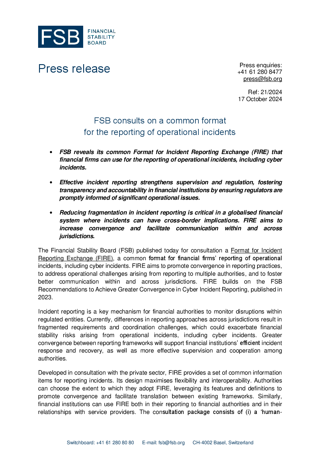 FIRE has been developed by the FSB in consultation with private sector participants. The FSB invites comments on this consultation report and welcomes replies to the consultation questions by 19 December 2024. Responses will be published on the FSB’s website unless respondents expressly request otherwise.