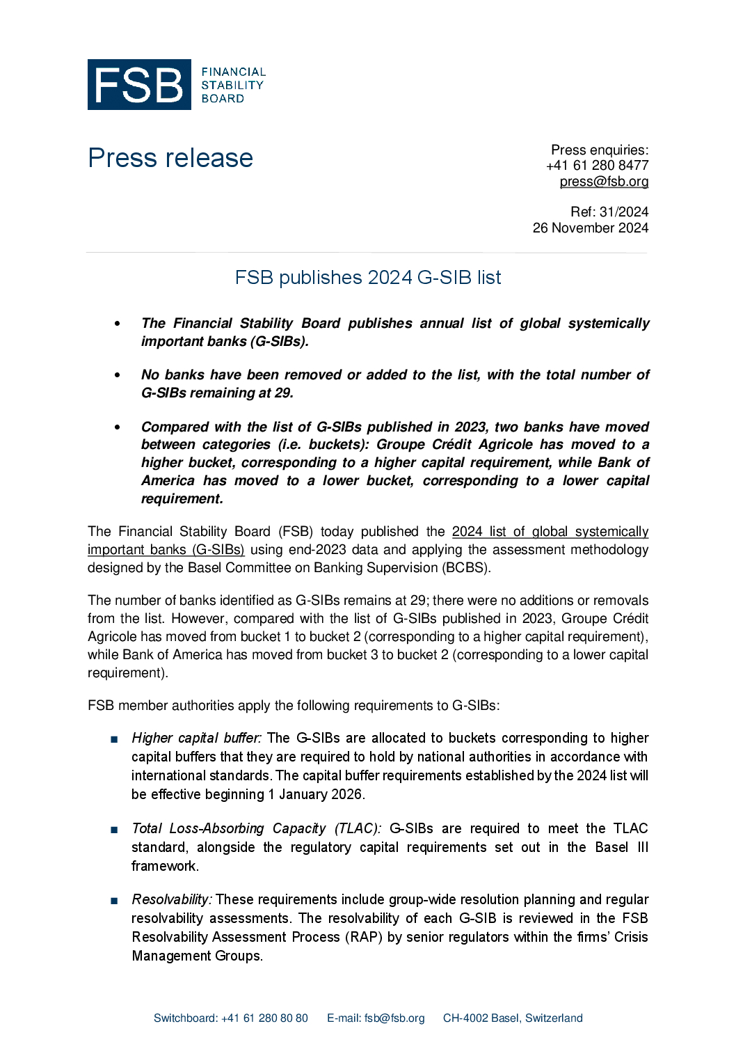 - The list for 2024 includes [29] G-SIBs, the same institutions as in the 2023 list but with different allocation of the institutions to buckets (see Annex). The changes in the allocation of the institutions to buckets (see below for details) largely reflect the effects of changes in underlying activity of banks, with the complexity category being the largest contributor to score movements. The higher loss absorbency requirement established with this list will be effective beginning 1 January 2026 if there is a bucket increase.4