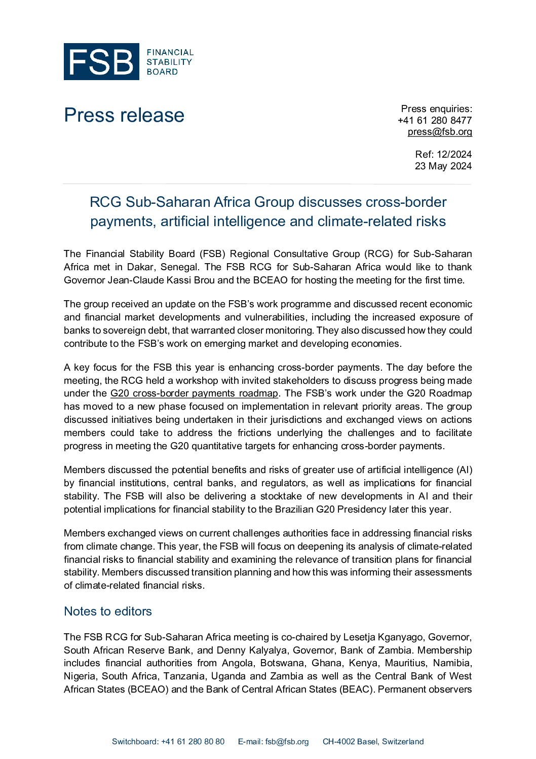The Financial Stability Board (FSB) Regional Consultative Group for Sub-Saharan Africa (RCG SSA) met on 6 December in Cape Town. The meeting was hosted by the South African Reserve Bank.