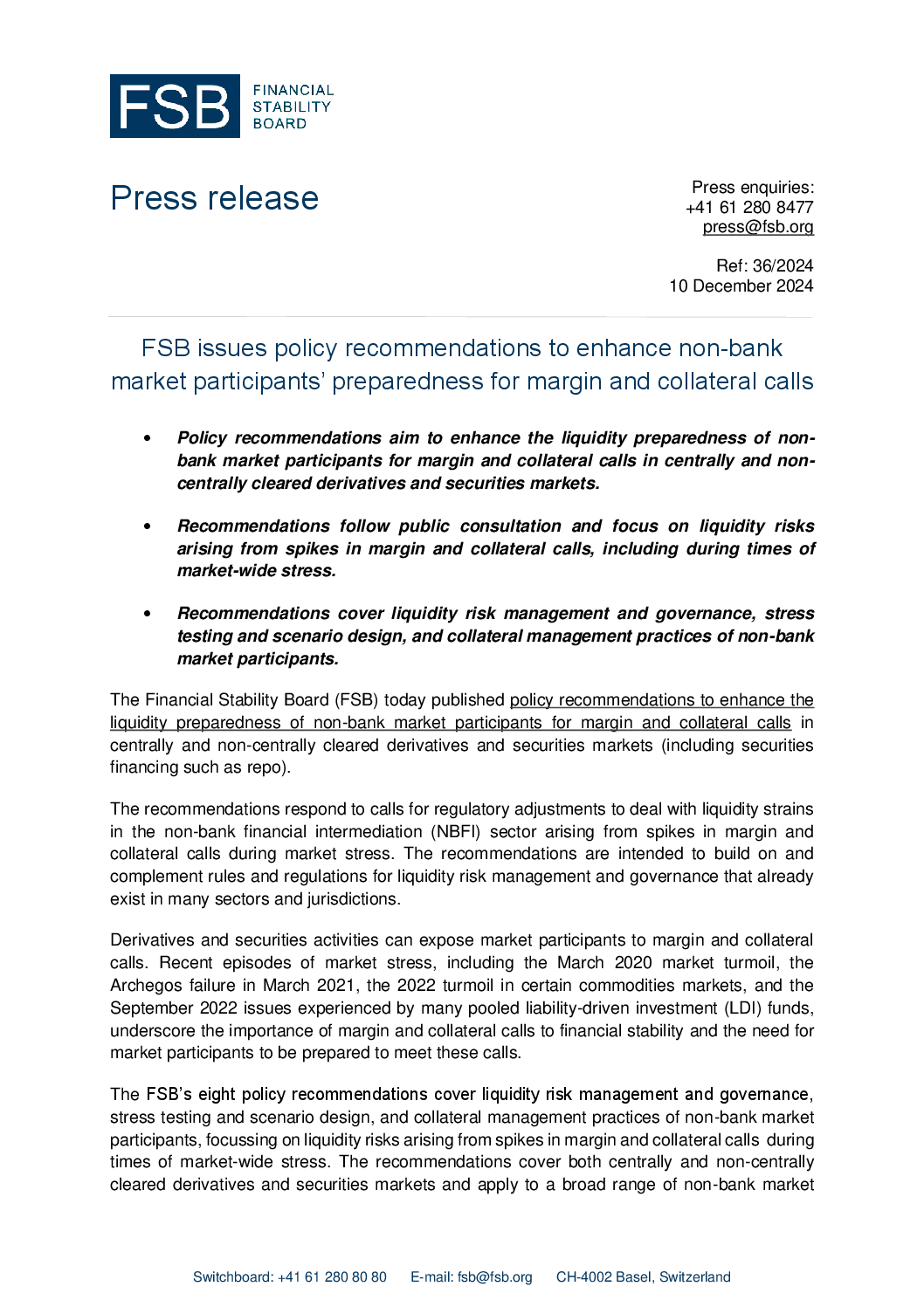 This report sets out steps to enhance the liquidity preparedness of non-bank market participants for margin and collateral calls in centrally and non-centrally cleared derivatives and securities markets. It forms part of the FSB’s work programme on NBFI.