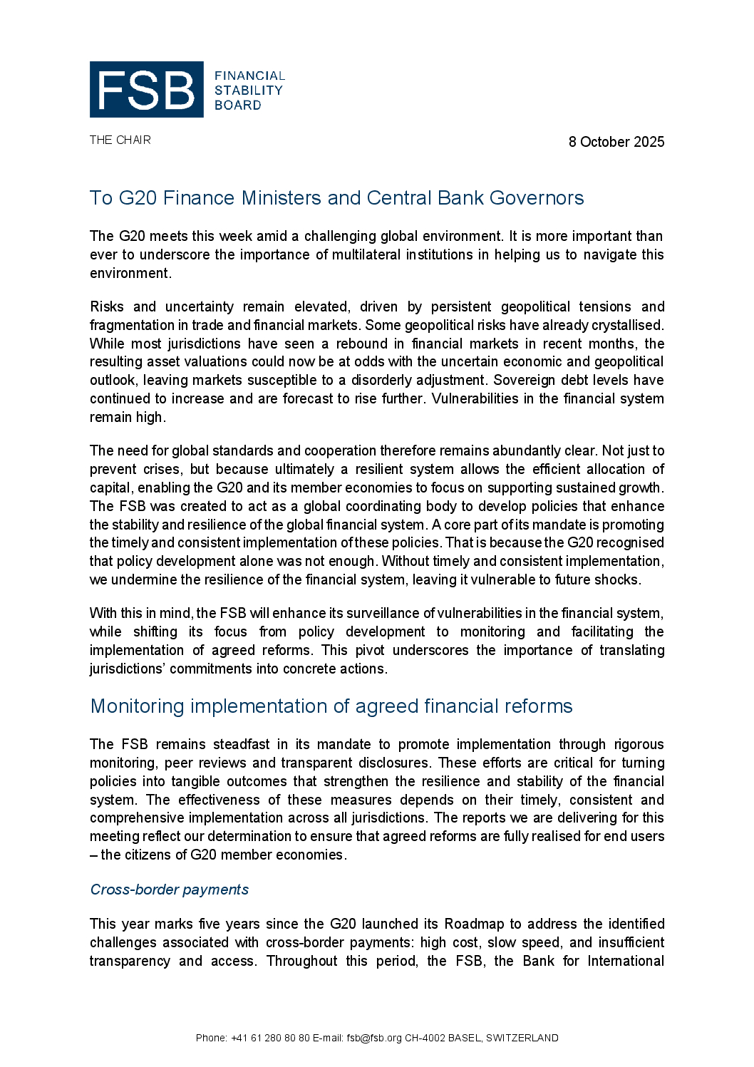 - In his letter to G20 Finance Ministers and Central Bank Governors, FSB Chair Andrew Bailey stresses the importance of multilateral cooperation and reform implementation in the current environment of elevated risks and uncertainty.