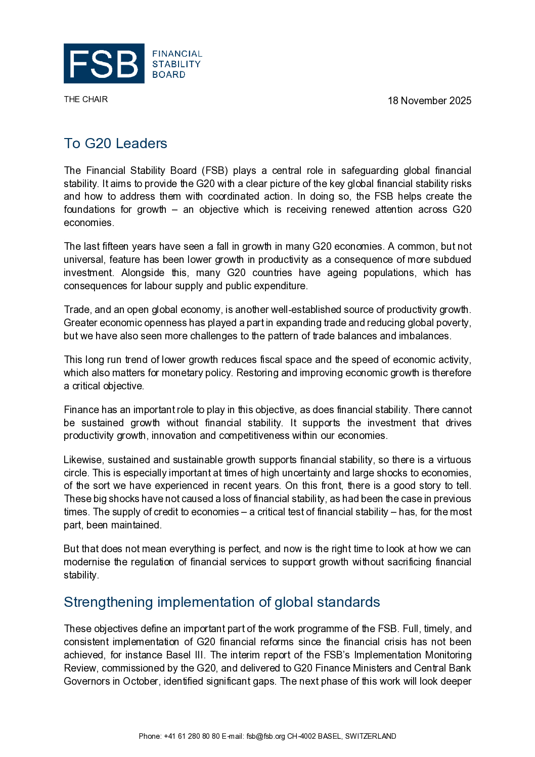 The letter concludes by reaffirming the FSB’s commitment to supporting G20 member countries in addressing these challenges, maintaining financial stability, and ensuring that finance contributes to sustainable and inclusive economic growth.