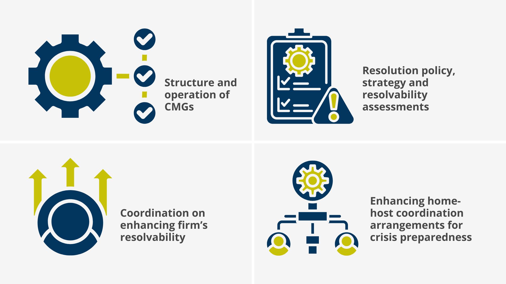 - coordination on enhancing firm’s resolvability; and