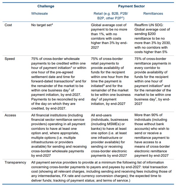 In 2021, the G20 Leaders endorsed the Targets for Addressing the Four Challenges of Cross-Border Payments: Final Report (Targets report), which established 11 global targets across three market segments: wholesale payments, retail payments, and remittances. These targets define the Roadmap’s ambition for addressing the four challenges, create accountability and provide a common vision for the improvements sought under the Roadmap.